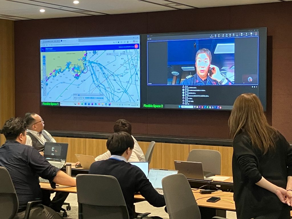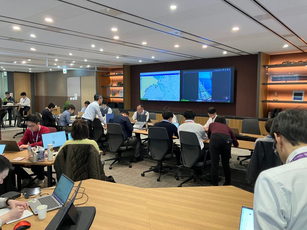 訓練では、衛星ブロードバンドインターネットサービス「Starlink」を介した高速データ通信によりリモート対話にて、船内の状況や情報を本社と共有しながら、本船乗組員と本社陸上従業員、外部関係機関参加のもと、緊急連絡や緊急時対応などの実情に即した訓練を実施しました。