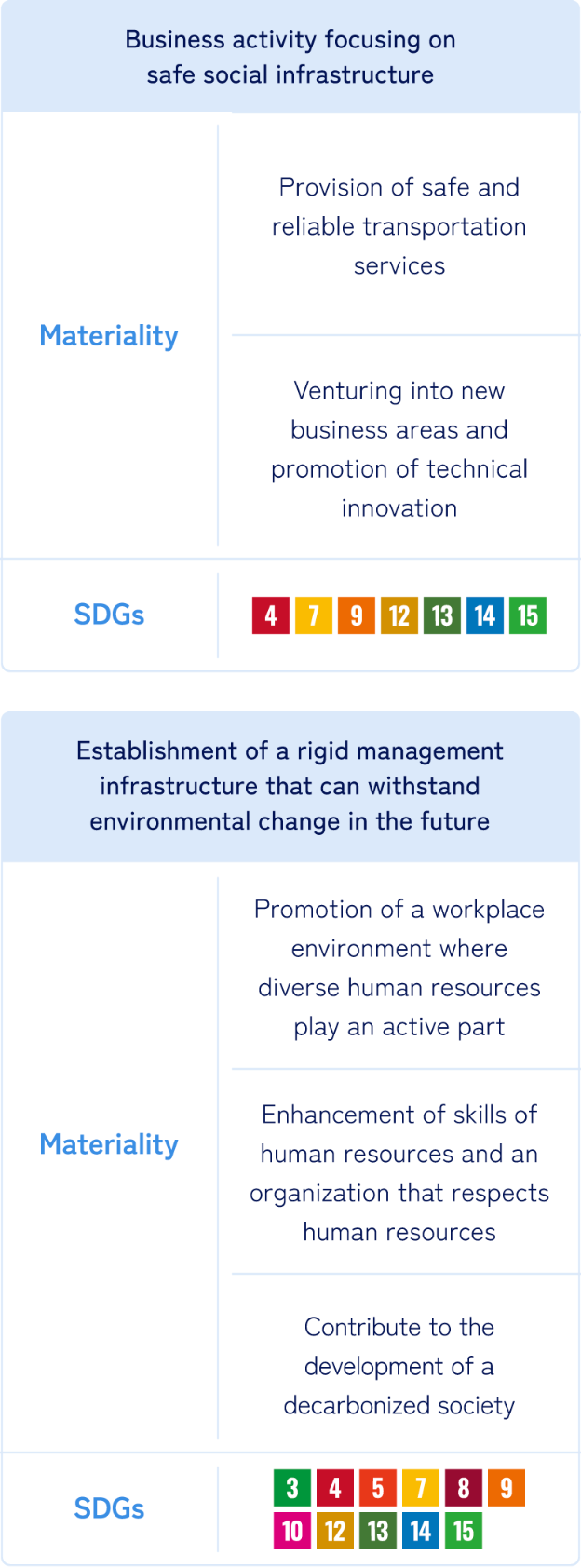 The environment surrounding our company presents a wide variety of social and environmental issues, such as climate change, labor load issues, and human rights issues. In order for us to continue our economic activities into the future, we need to recognize and evaluate the impact of these various issues on our corporate activities and clarify the issues to be addressed.